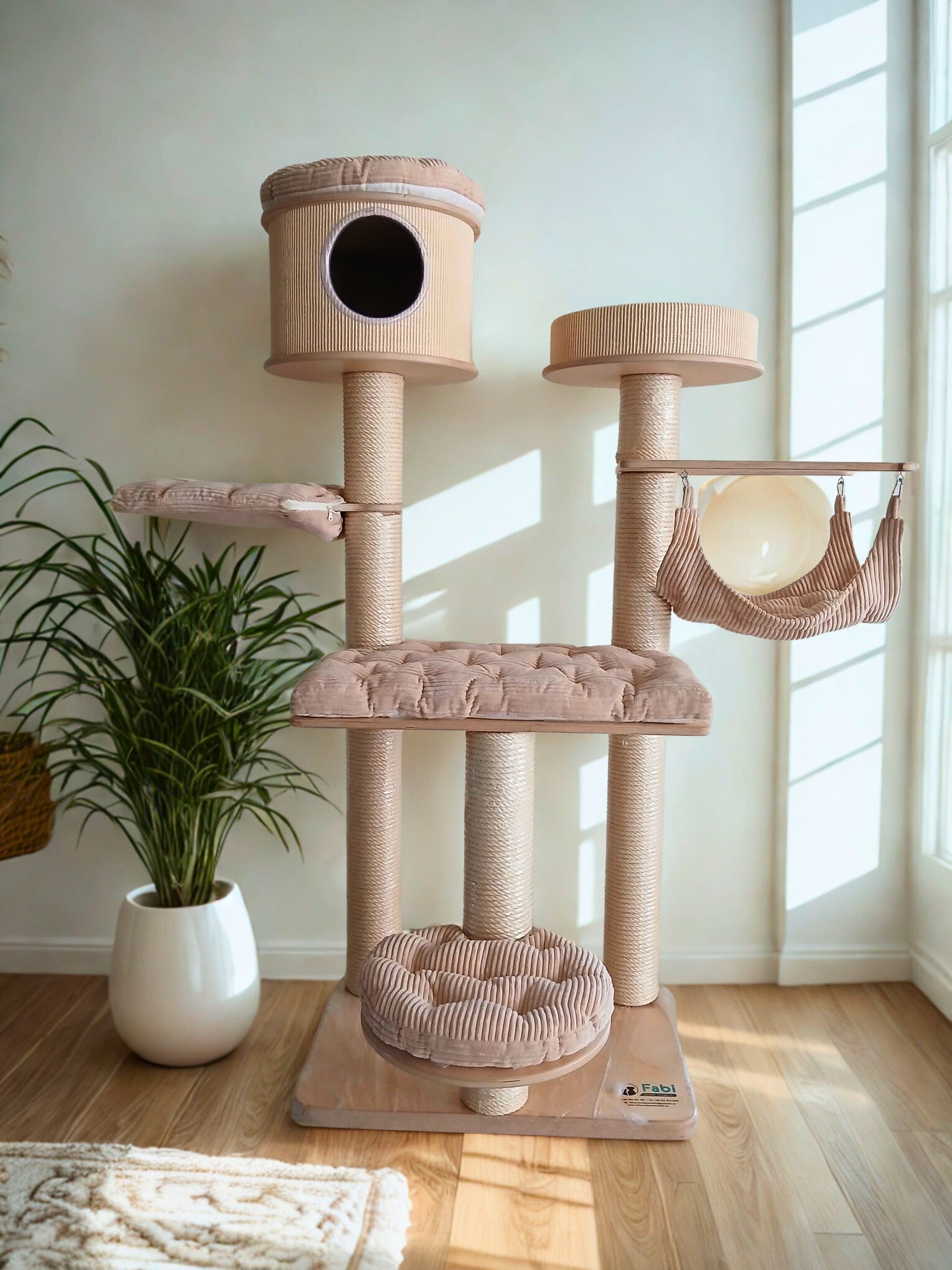 Questo modello mette a disposizione ben 7 postazioni comode, tra ripiani imbottiti e una morbida amaca in tessuto beige. I cuscini lavabili mantengono la loro forma anche dopo i lavaggi, assicurando igiene e comfort costanti. Le colonne rivestite in corda resistente permettono al tuo gatto di affilare le unghie senza rovinare i mobili di casa.