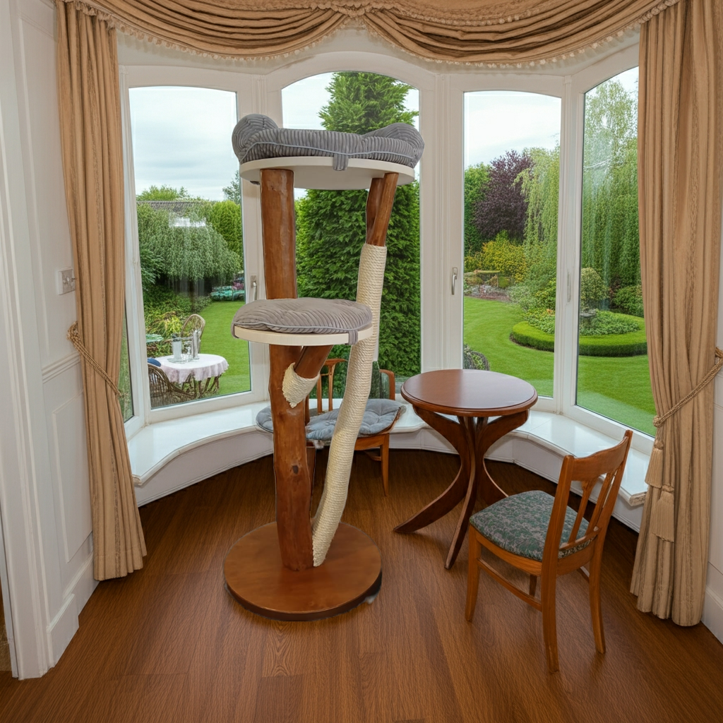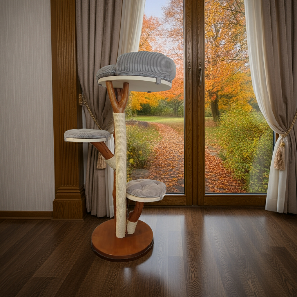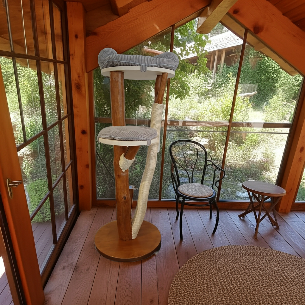 Un tiragraffi di alta gamma, realizzato artigianalmente in Italia con veri tronchi di faggio massiccio, pensato per garantire robustezza, eleganza e comfort duraturo. La struttura in legno naturale, unita al rivestimento in corda resistente, offre una solidità superiore rispetto ai comuni tiragraffi, rendendolo perfetto anche per gatti di taglia grande o particolarmente attivi.